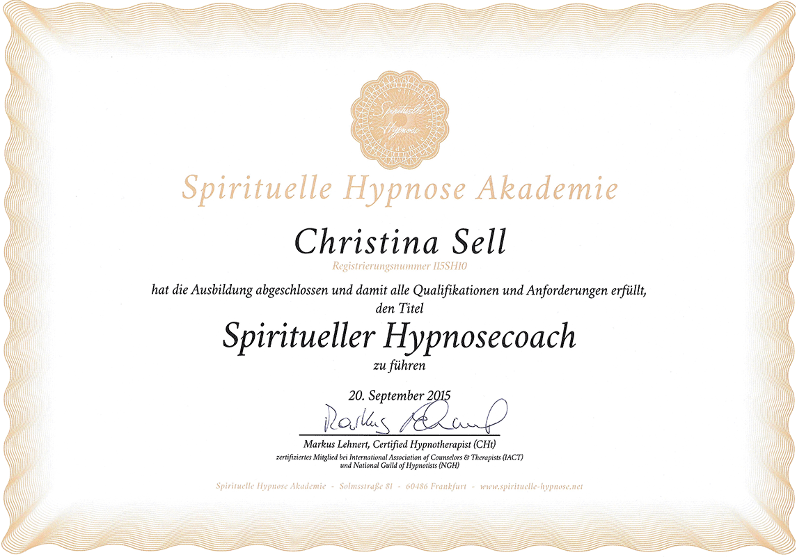 Nach meiner Ausbildung zur Entspannungstrainerin für Progressive Muskelrelaxation (PMR) nach Edmund Jacobson hatte ich das Bedürfnis noch mehr in die Welt der Entspannung einzutauchen. Ich beschloss, die Hypnose mit in meine Kurse einzubauen. Deshalb begann ich am Thermediusinstitut München mit den Grundlagen der Hypnosetherapie und wechselte danach zur Spirituellen Hypnoseakademie Markus Lehnert Frankfurt. Es war eine unbeschreibliche emotionale Entwicklung, die jeder Einzelne erfahren durfte, da wir in der Ausbildung erst an uns selbst arbeiteten.