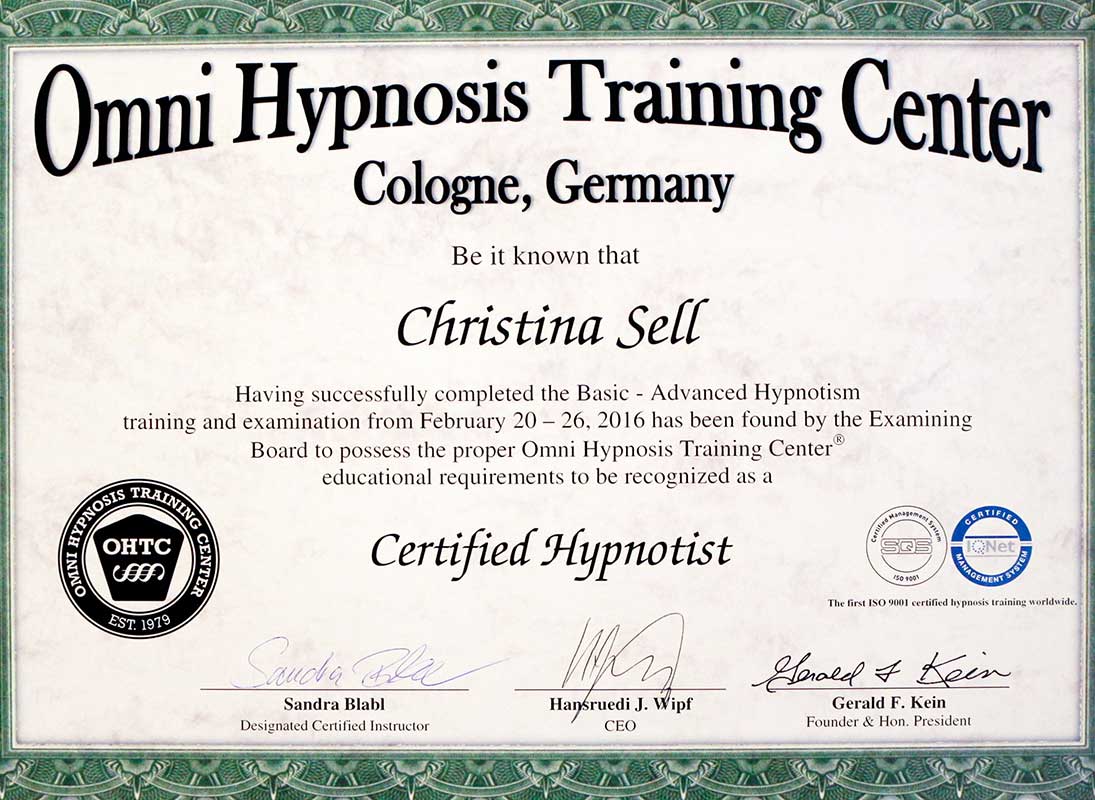 Die Hypnose faszinierte mich mehr und mehr und ich wollte mir noch tieferes Wissen aneignen. So beschloss ich im Anschluss die 7 Tage Intensivausbildung am OMNI Hypnosis Training Center bei Sandra Blabl in Köln zu absolvieren.